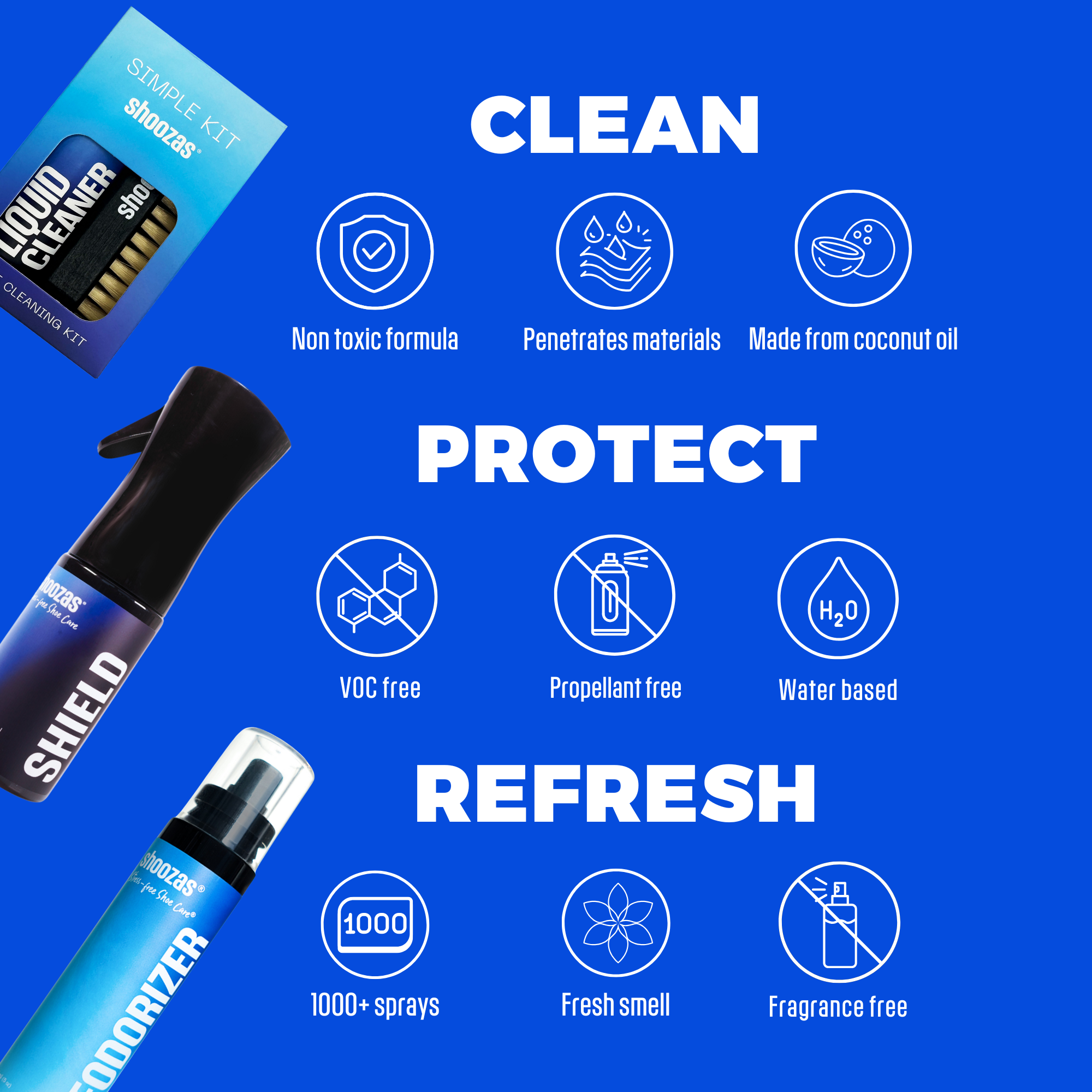 Clean, protect, and refresh your sneakers with this Bundle! Remove stains, keep them protected from water and stains, and eliminate odors from everyday use.