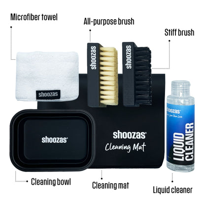 Wipe dry with the microfiber towel and leave shoes to air dry. Rinse brushes and cleaning mat with water before storing. Wash the microfiber towel before using again.